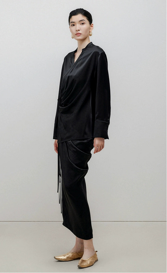 ZHUCHONGYUN black wrap-style tie waist long sleeved top-REIGN.