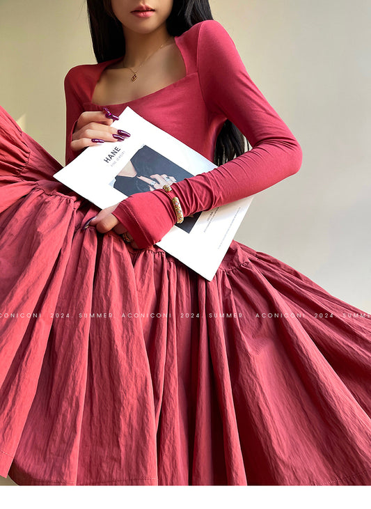 Aconiconi Elegant Beige Crew Neck Top/ High Waist Loose Long Skirt- Sea of Clouds Wind Chime