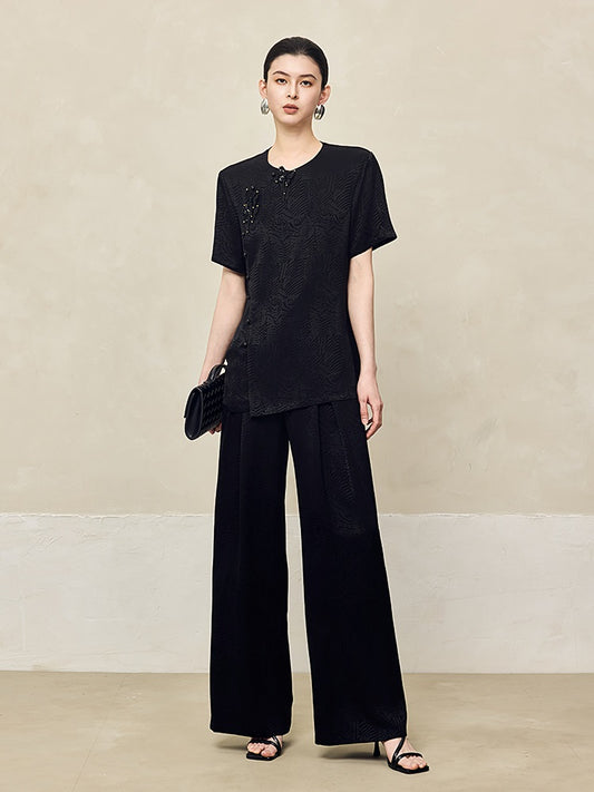 HECO Jacquard Drapy Wide-leg High Waist Casual Black White Pants - COMMAND.
