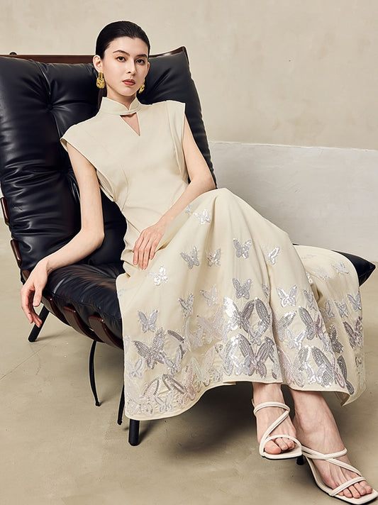 HECO Jacquard Acetate Hollow Stand Collar Thin A-line Black White Dress Women - WEIGHT.