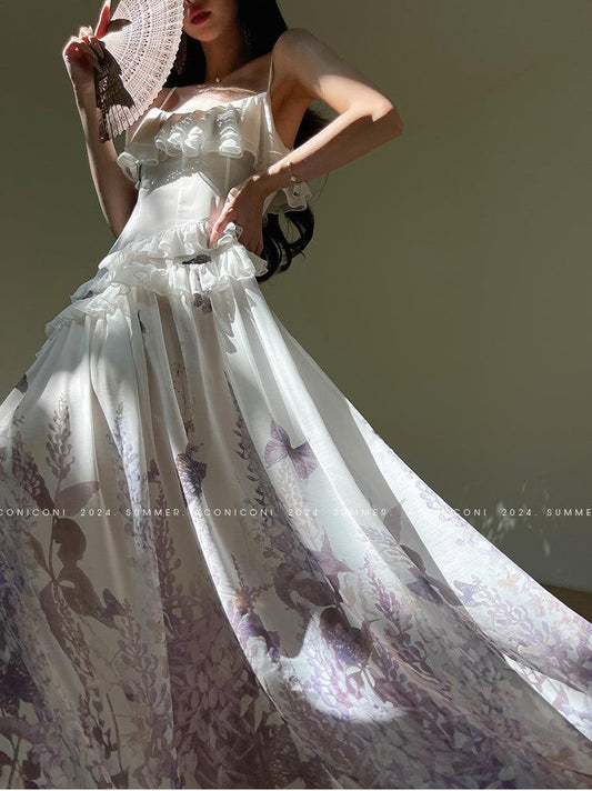 Aconiconi Elegant Square Collar Sleeveless Butterfly Print Resort Dress- Butterfly Dance Purple Smoke