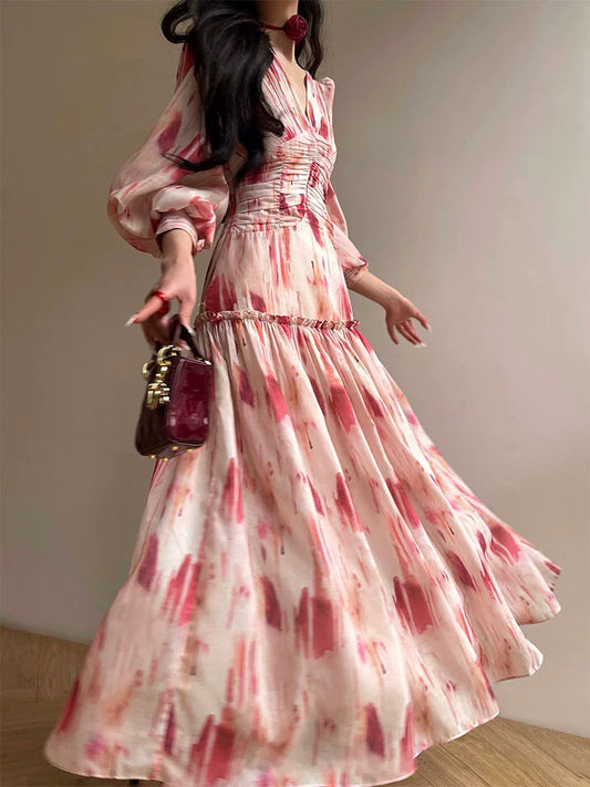 Aconiconi Elegant Rose French Print V-Neck Long Sleeve Long Summer Dress- Wild Rose