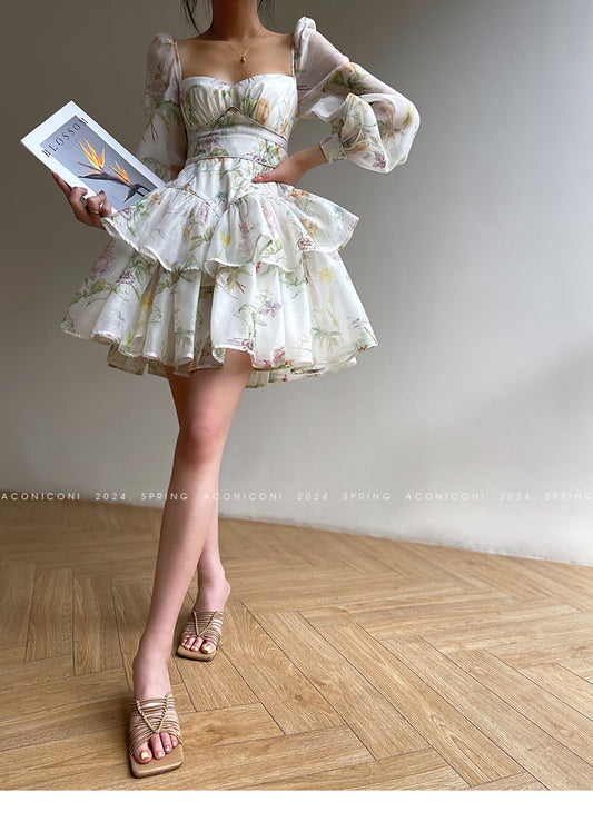Aconiconi Elegant Square Collar French Flower Print Tea Dinner Dress - Berlin Flower