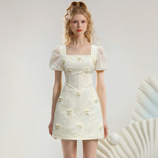 CHECOCRE ELEGANT DIAMOND CHAIN PUFF SLEEVE WHITE DRESS - IDOWU
