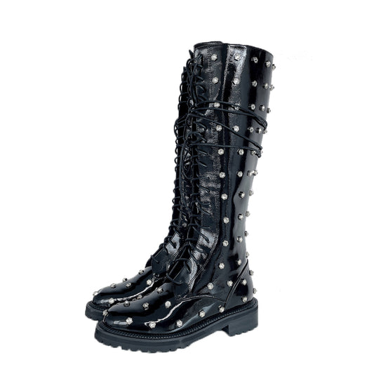 B-FEI niche stars diamonds lace adjustable head layer patent leather biker boots - libra
