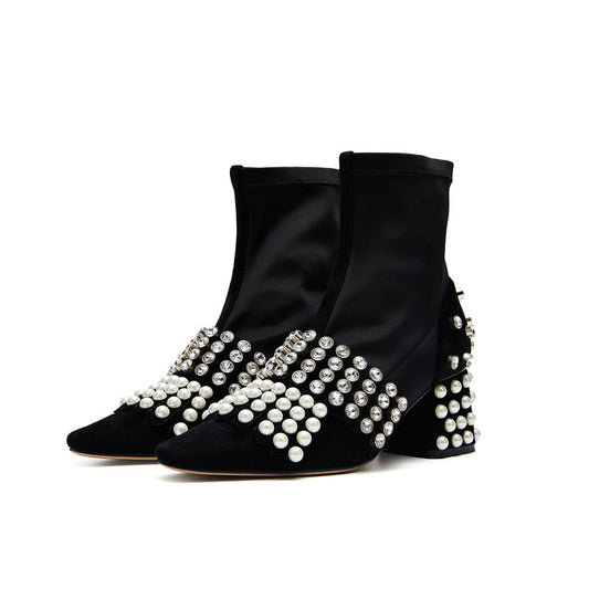 B-FEI diamond rhinestone pearl short thick square heel elastic boots- Olia