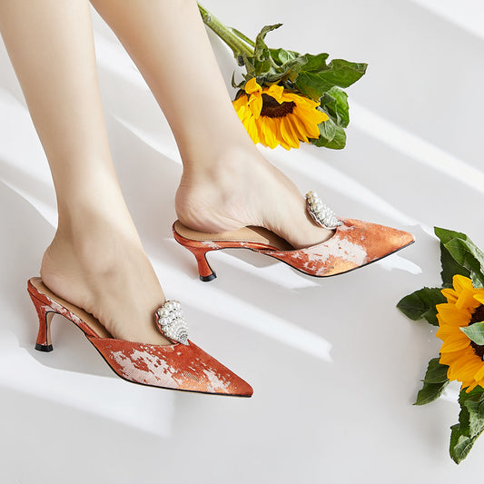 B-FEI bridgertons inspired historical shoes Kitten Heel Orange Shell Pearl Pointed Toe mules - Nova