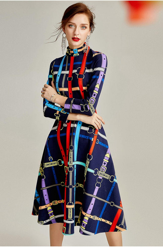 Belt print high neck multi colored full swing dress vintage retro inspired audreys dress - Adahl