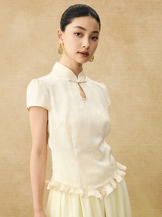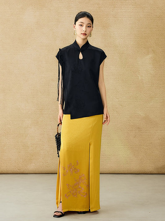 HECO Chinese Peony Buckle Short Sleeve Acetate Tassel Top - TEACH .