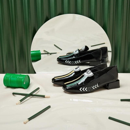 Black Rider Pattern Loafer square heel low women's oxford loafer shoes - Hars