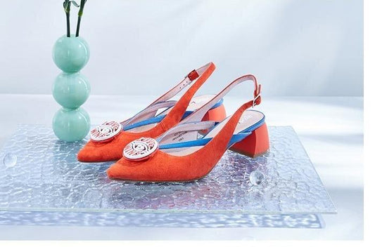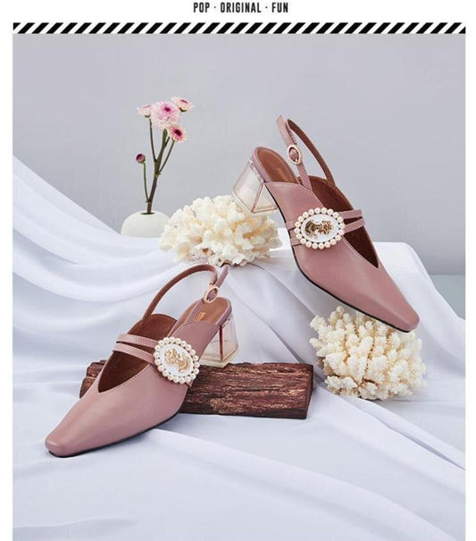 HOA spring new pointed toe round badge thick square heel kitten pumps - Lumi