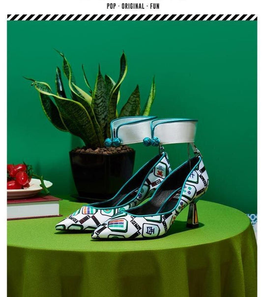 Goldfish mahjong printed kitten heel satin ankle strap high heels pumps - Teidi