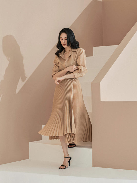 HIGH END PLEATED MIDI SKIRT WITH LONG SLEEVE SHIRT TWO PIECE SET - ANEDA