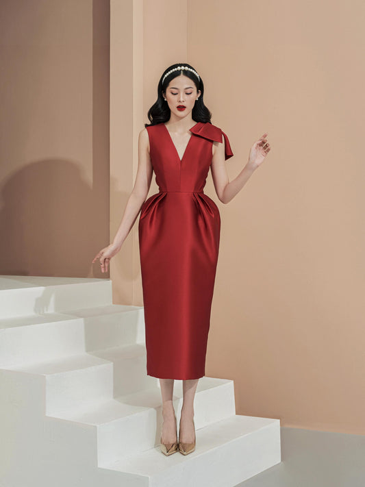 LUXURY RED ENGAGEMENT BOW MIDI DRESS - LUKA