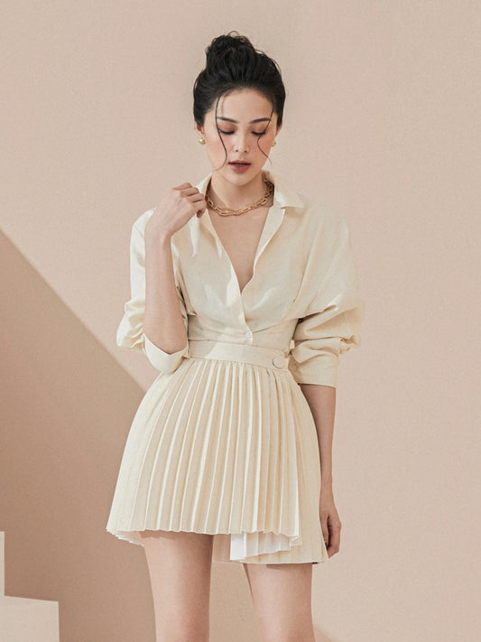 PLEATED MINI SKIRT WITH BUTTON + FRONT-PLEATED SHIRT - CRATI