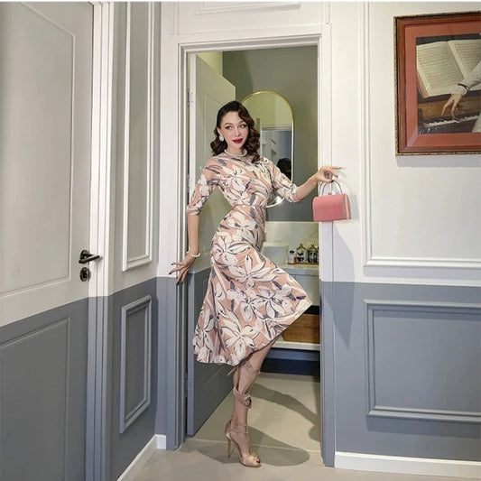 Le Palais Vintage Elegant Pink Gray Floral retro Dress-Judith