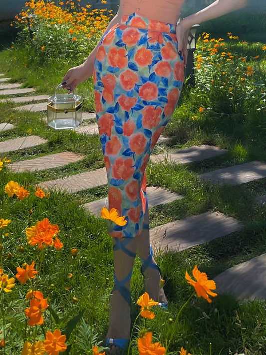 Le Palais Vintage Elegant Orange Flower Design High Waist Slim Fit Pencil Skirt-Sara