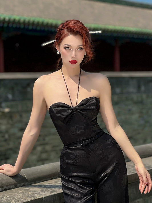 Le Palais Vintage Style Black Dragon Pattern Fishbone Corset Slim Fit Pants-Serena