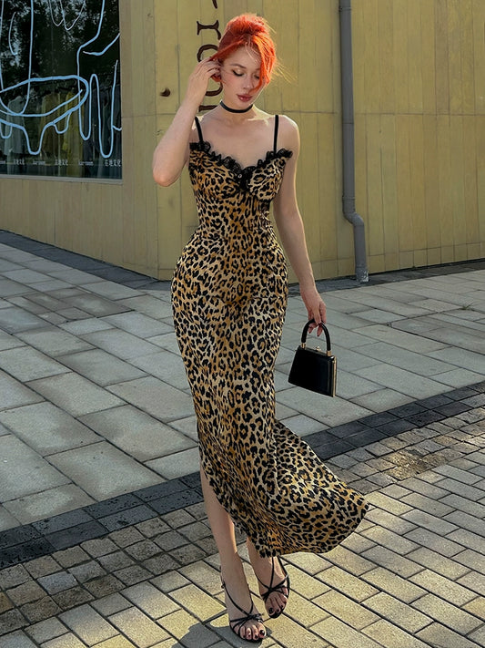Le Palais Vintage sensual elegant leopard print faux silk satin slim wrap maxi dress-ASTA