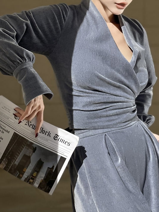 Le Palais Vintage Elegant long sleeves V-neck matte velvet dinner wrap top-Maryann.
