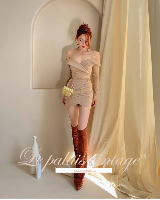 Le Palais Vintage Beige Suede Off-the-Shoulder Dinner Dress-Zoey