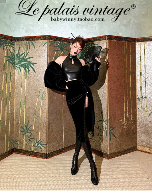 Le Palais Vintage Luxury Retro Black Cotton Short Fur Jacket High Waist Skirt-Carla