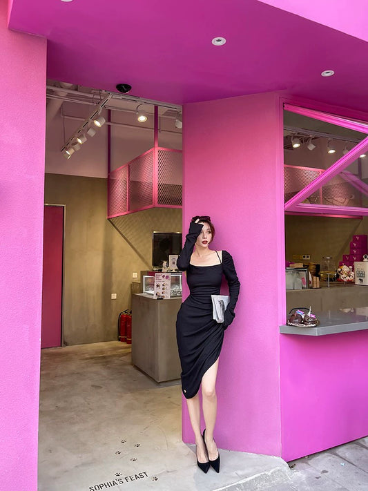 Le Palais Vintage Elegant Black Knit Open Back Pleated High Slit Sexy Dress-Plum