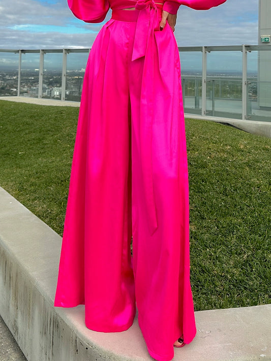 Le Palais Vintage Elegant Barbie Pink Silk Shirt High-Waist Wide-leg Pants-Kate