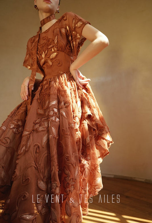 LE VENT&TES AILES Luxury French Disc Embroidered Sequin 3d Vintage brown Dress - LINA