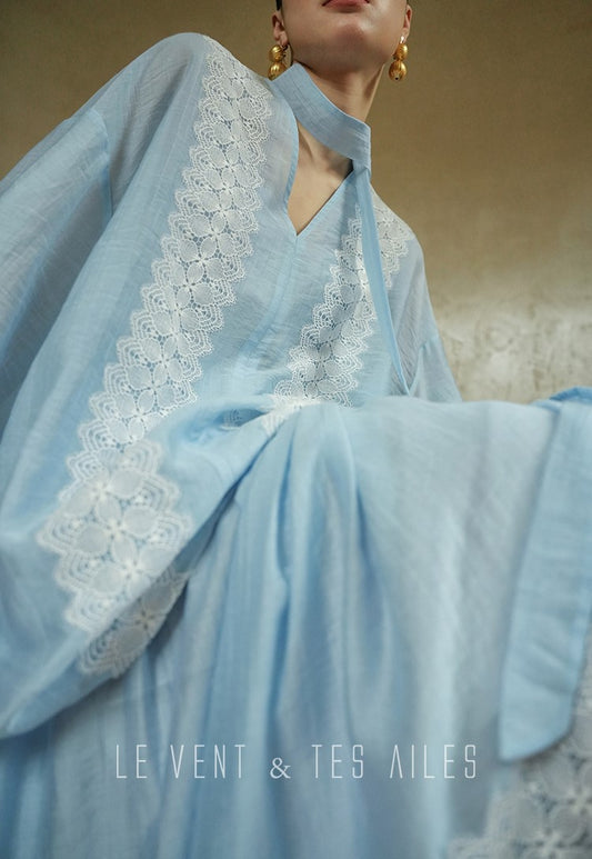 LE VENT&TES AILES pastel blue elegant summer vacation V-neck shirt skirt set -GWEN