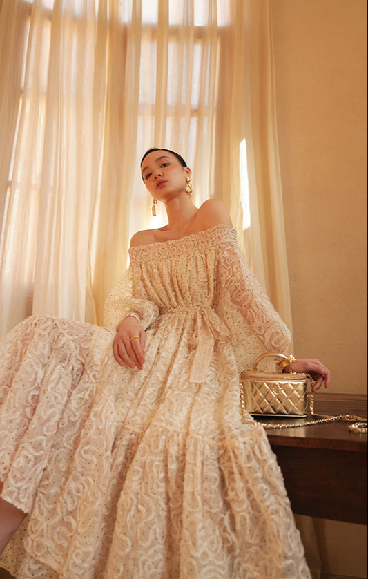 LE VENT&TES AILES Luxury off-Shoulder Lace Jacquard 3d Detailing white Dress- ZORA