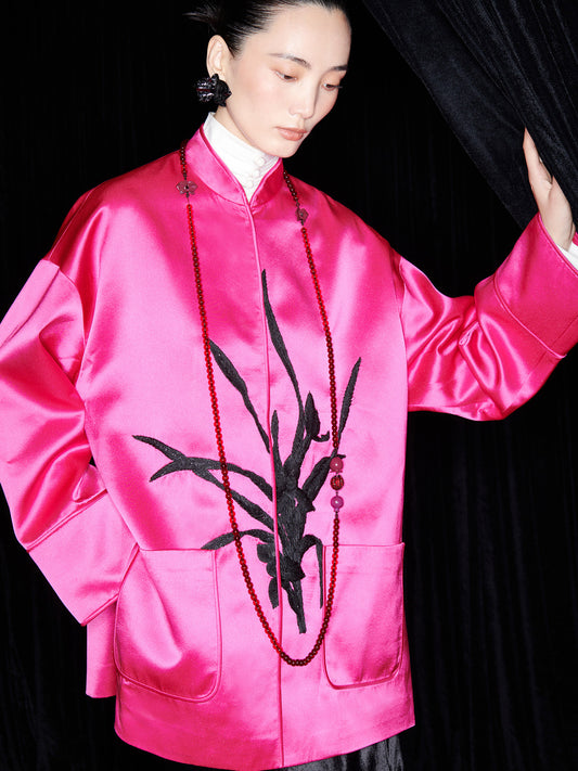M ESSENTIAL Mackay designer Orchid silhouette patch Silver glitter satin coat - SWEAD