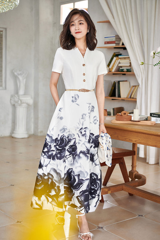 High-end fall short sleeve v-neck print retro dress- Adi