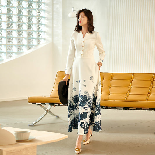 High-end fall long sleeve v-neck print retro dress- Adia