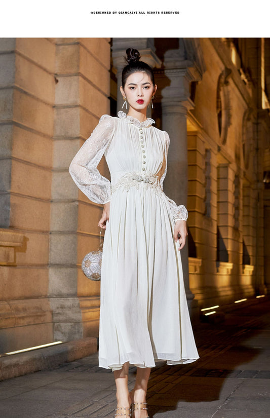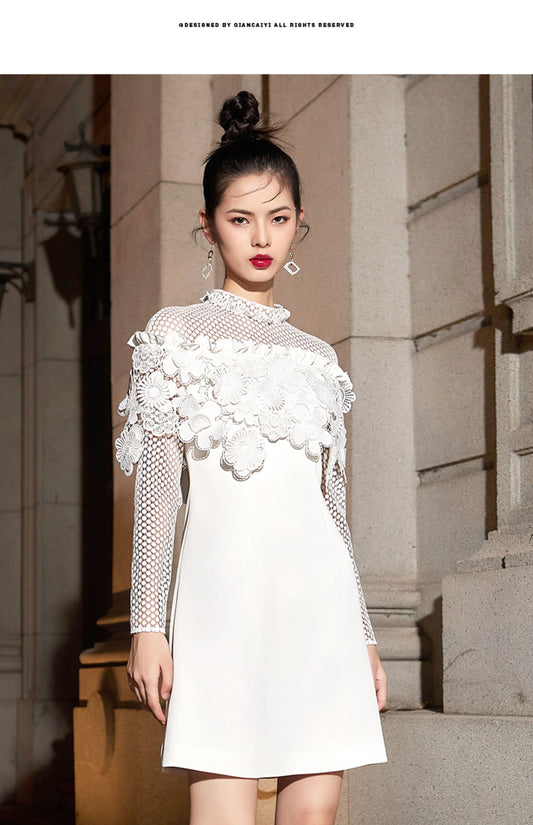 White long-sleeved dress is crafted with three-dimensional embroidery - Perfecta