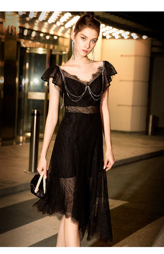 Black evening skirt high-quality texture with a lace see-through dress- Cora