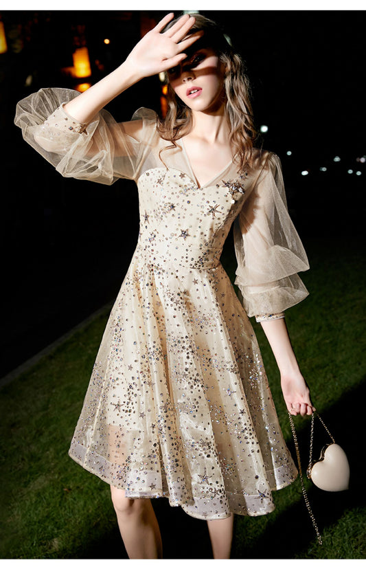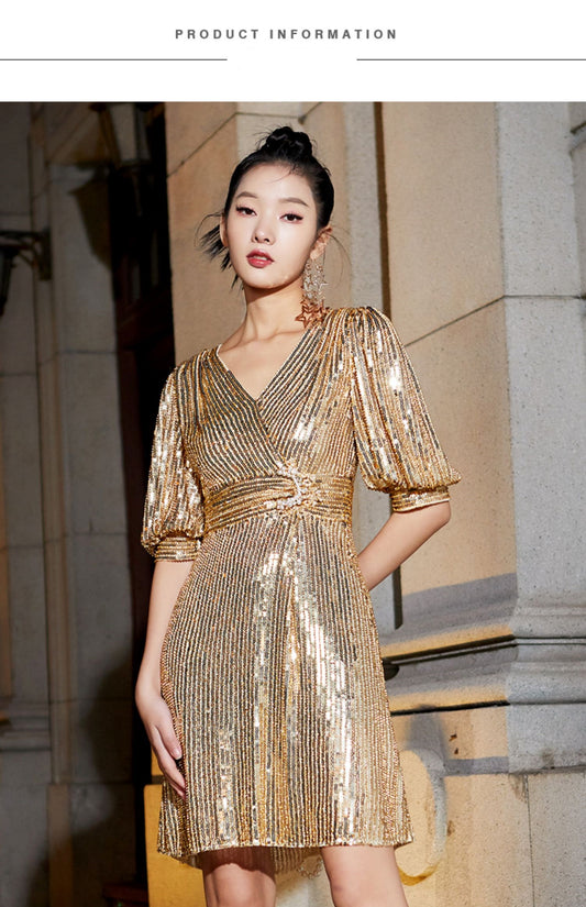 Elegantly gold designed and fashionably built V-neck striped sequins dress- Paris