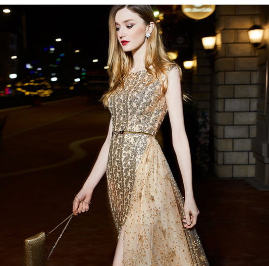 High-end luxury Gold shimmery sleeveless evening dinner dress - ipi
