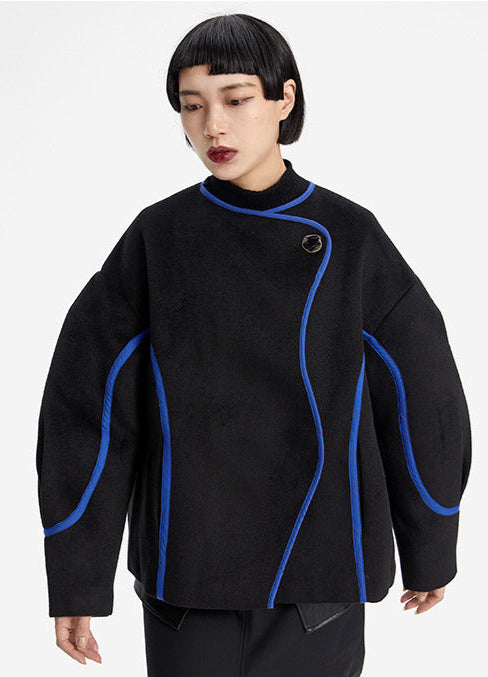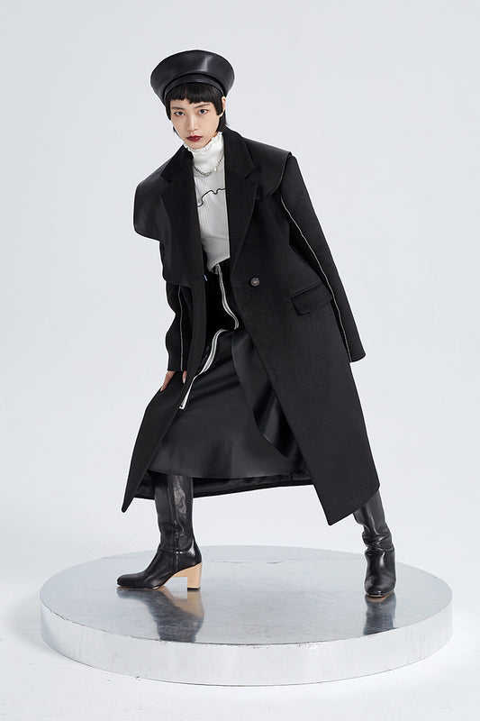 TINY IN long over-the-knee tweed coat jacket suit collar shawl detachable black coat-KEKE