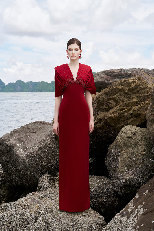 Tracy Studio luxury crystal embellished Flared Sleeves Deep V-Neck Dress - Tilda Red