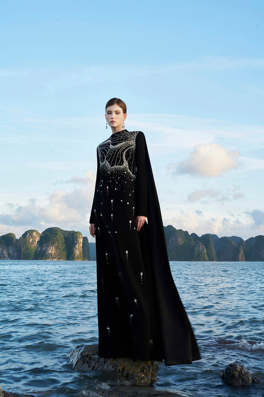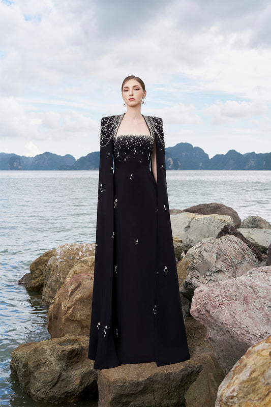 Tracy Studio luxury crystal embellished Long Cape Sleeve Floor Length Evening Dress - Tyra