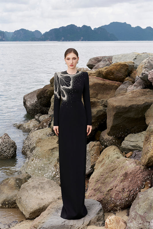 Tracy Studio luxury Bead embellished Rainfall Long Sleeves Evening Dress - Taryn