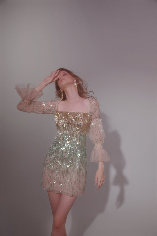 Wardrobes by Chen High End Golden Green multi color sequince mini dress-Serah