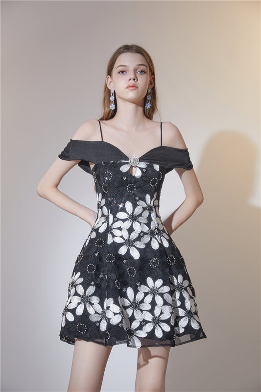 Wardrobes by Chen Elegant Black and White Off Shoulder Flower Dress-YEMMY