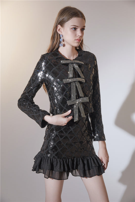 Wardrobes by Chen Black sequin Long Sleeve Top + High Waist Short Skirt-SARA