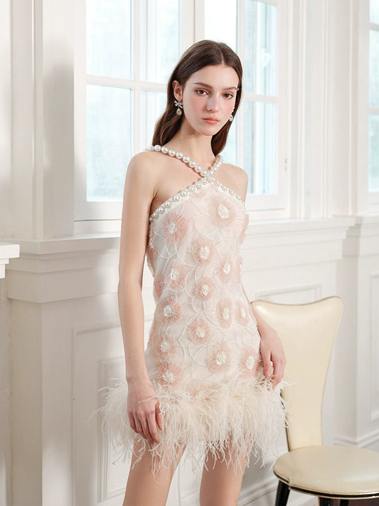 Wardrobes by Chen Luxury Pink Pearl Halter Neck Embroidered Feather Dress-Stacey