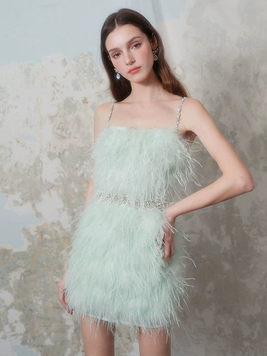 Wardrobes by Chen Luxury Mint Green Diamond Chain Strap Feather Short Dress-Sam