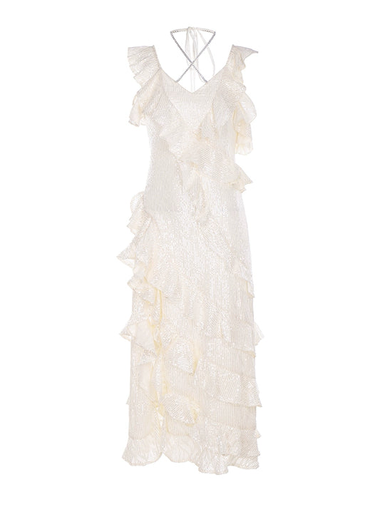 Wardrobes by Chen Luxury Off White French Ruffle sequin holiday Dress-Nana