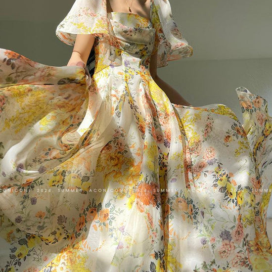 Indulge in the luxury of our Aconiconi Elegant Flower Print Square Collar Short Sleeve Banquet Dress-Nini. Crafted with an elegant floral print and unique square collar, this sophisticated and chic dress is perfect for any special occasion. Its stylish design and pretty details make it a must-have for dinner, church, or wedding events. Elevate your style with this classy and fashionable dress.