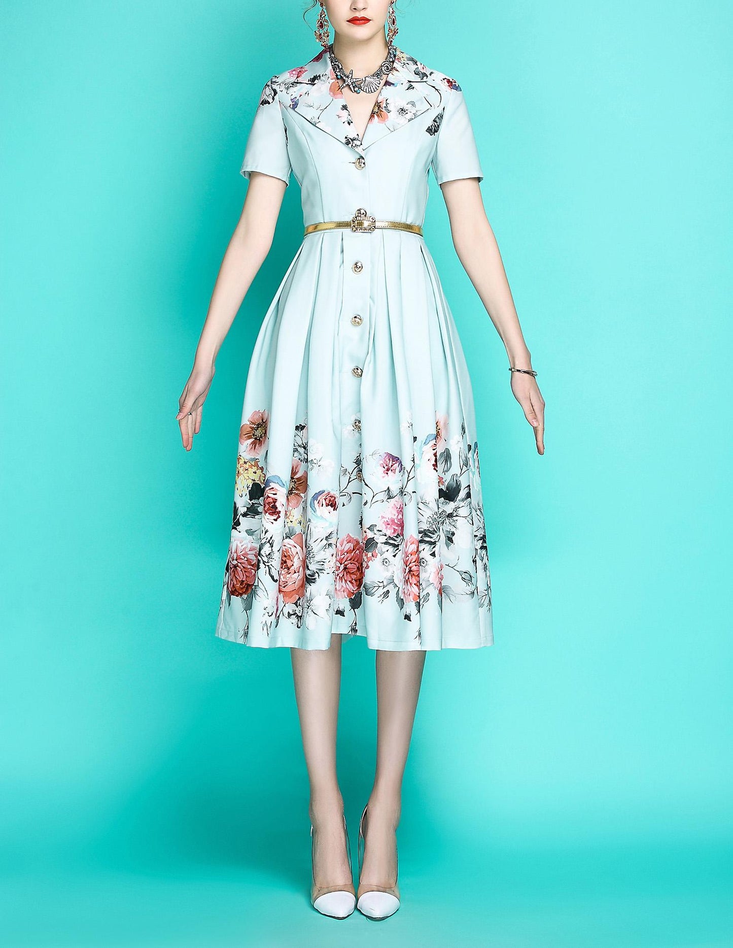 Gorgeous floral print white collar pleat dress. perfect for every occasion and scenario. From dates to work, to weddings. This 1950’s vintage inspired print is inspired by Audrey Hepburn’s style brought up to date with today’s trendy elegance. High-quality high-density plain fabric texture, delicate skin-friendly
